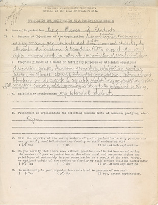 Gay Alliance of Students (GAS) Application for Registration as a Student Organization, 1974 October 2