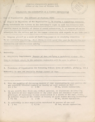 Typewritten four page form filled in by a typewriter, with handwritten signatures of Brenda C. Kriegel and Stephen M. Lenton. The heading on the form reads "Virginia Commonwealth University, Office of the Dean of Student Life" and includes a stamp reading "Sep 1974 Received by the Office of Student Life." The form contains information about the Gay Alliance of Student's application for registration as a student organization at VCU.
