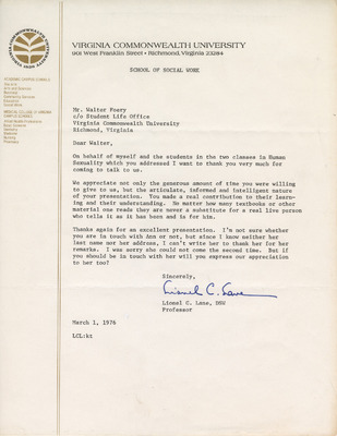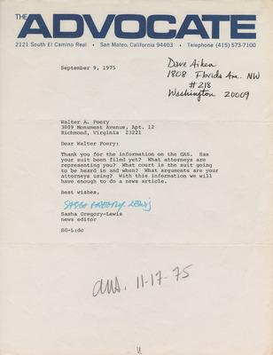 One page typewritten letter from Sasha Gregory-Lewis, News Editor at The Advocate, to Walter A. Foery. Gregory-Lewis thanks Foery for information about the Gay Alliance of Students (GAS) and asks about the upcoming court case in which GAS sued Virginia Commonwealth University.