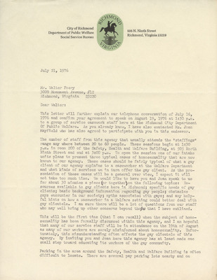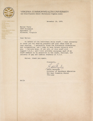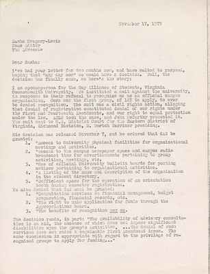 Two page typewritten letter from Walter A. Foery to Sasha Gregory-Lewis, News Editor at The Advocate updating Gregory-Lewis on the status of the Gay Alliance of Students (GAS) lawsuit against Virginia Commonwealth University.