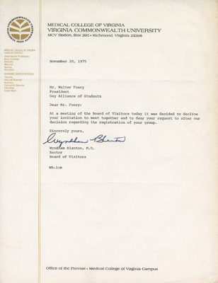 On October 17, 1974, VCU’s BOV denied GAS’s application on the grounds that the "existence of GAS as a recognized campus organization would tend to attract other homosexuals to the University." The decision prompted responses from students and campus organizations, some of whom voiced opposition in the Commonwealth Times. On April 9, 1975, local attorney John M. McCarthy filed a suit on behalf of GAS, arguing that VCU violated the students’ First and Fourteenth Amendment rights. Represented by Virginia’s assistant attorney general, the university defended its denial by offering four reasons: “1) GAS would increase opportunities for homosexual contact; 2) the existence of GAS as a registered organization would encourage some students to join the organization who otherwise might not join; 3) being involved in GAS could be socially and psychologically harmful to individuals; 4) and GAS would tend to attract more homosexuals to VCU.” (Hevel and Cain, 60).