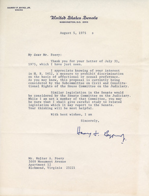 Letter from Harry F. Byrd to Walter Foery, 1975 August 5