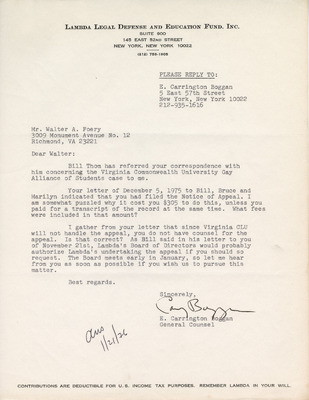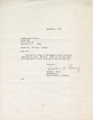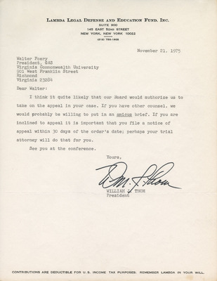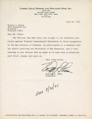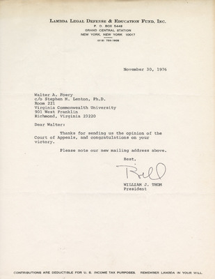 One page typewritten letter from William J. Thomas, President of Lambda Legal Defense & Education Fund, to Walter A. Foery. Thomas mentions that the Gay Alliance of Students (GAS) lawsuit against VCU has been brought to their attention by the National Gay Task Force (NGTF) and offering the support of Lambda Legal.