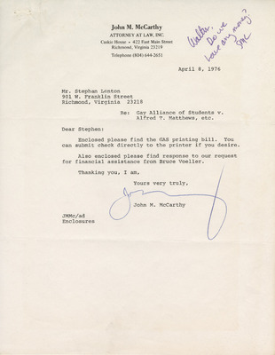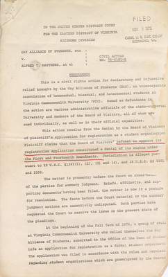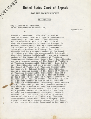 This collection contains legal documents, correspondence, applications, and other materials related to the VCU Gay Alliance of Students (GAS) and its court case against the university from 1974 to 1976. The case, Gay Alliance of Students v. Matthews was one of the first LGBTQ+ student organizing cases to reach the federal appellate level. The ruling effectively changed existing law in the five states within the jurisdiction of the Fourth District Circuit: Maryland, Virginia, North Carolina, South Carolina, and West Virginia.