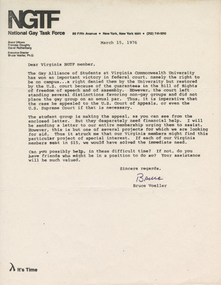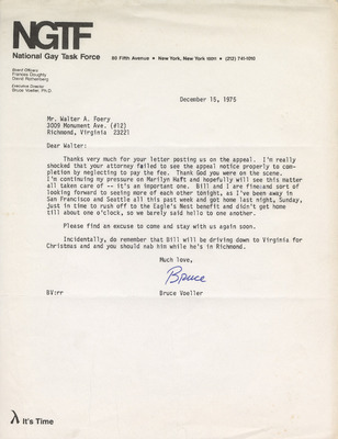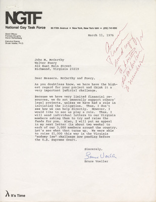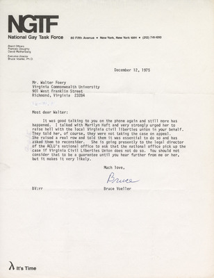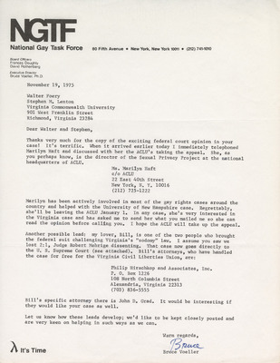 One page typewritten letter from Bruce Voeller, Executive Director of National Gay Task Force (NGTF) to Walter Foery. Voeller mentions Marilyn Haft, Director of the Sexual Privacy Project at the ACLU. He also mentions Philip Hirschkop and Associates, Inc., who were handling a case for the Virginia Civil Liberties Union. This case appears to be Doe v. Commonwealth's Attorney of Richmond.
