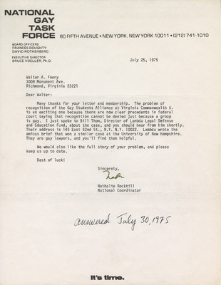 One page typewritten letter from Nathalie Rockhill, National Coordinator of National Gay Task Force (NGTF) to Walter A. Foery. Rockhill connects Foery with Bill Thom, Director of Lambda Legal Defense and Education Fund in regards to Gay Alliance of Students v. Matthews.
