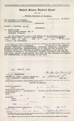 Deposition Subpoena to Testify of Produce Documents or Things, United States District Court for the Eastern District of Virginia, Gay Alliance of Students v. Matthews to Walter Foery, 1975 June 19