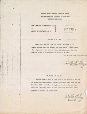 One page typewritten document from the U.S. District Court for the Eastern District of Virginia signed by Walter Foery. It is a notice of appeal to the judgement in Gay Alliance of Students v. Matthews.