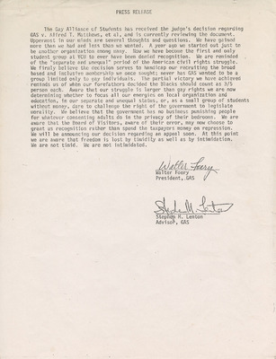 One page typewritten press release from Walter Foery, President of GAS, and Stephen M. Lenton, GAS Advisor, regarding the court decision in Gay Alliance of Students v. Matthews. The document has no date but was likely created shortly after the November 7, 1975 decision.