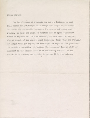One page typewritten press release GAS regarding the court decision and their plan to appeal in Gay Alliance of Students v. Matthews. The document has no date but was likely created shortly after the November 7, 1975 decision.