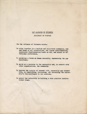 One page typewritten document listing five items in the Gay Alliance of Students Statement of Purpose.