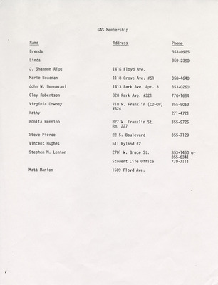 One page typewritten document listing the names, addresses, and phone numbers of members of the Gay Alliance of Students.
