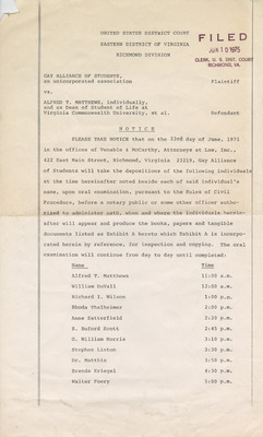 Notice, United States District Court for the Eastern District of Virginia, Gay Alliance of Students, 1975 June 10