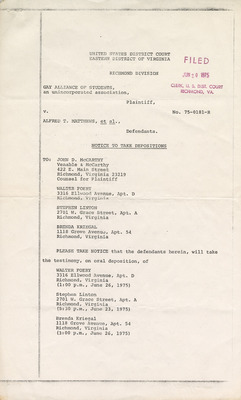 Notice to Take Depositions, United States District Court for the Eastern District of Virginia, Gay Alliance of Students, 1975 June 20