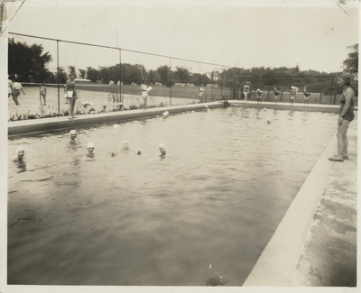 A photographic print of approximately two dozen individuals in and around a swimming pool surrounded by a chain link fence, with a tennis court, field, and trees visible in the background. The heads of approximately twelve individuals are visible in the pool, with another five standing on the right side of the pool. Four of those individuals prepare to dive. On the north side of the pool are two individuals with clipboards, and another individual stands on the south side looking at those swimming. One individual leans on the other side of the chain link fence. All individuals involved in swimming activities appear to be white. On the tennis court behind the chain link fence, three individuals are partially visible, including a child. They appear to be Black. "Layton's studio 819 E. Broad St. Richmond, Va" stamped on back. "#9" handwritten on back.