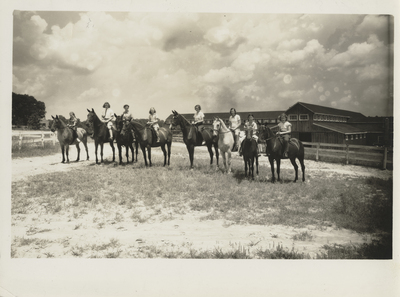 A photographic print of eight individuals sitting atop eight horses in a field. A large stable is visible in the background. All individuals appear to be white. "Layton's studio 819 E. Broad St. Richmond - Va. | DAY CAMP Girl Scouts Girl Reserves 101 N Jefferson ST. 6 N, 5th ST. Richmond Va | GIRL SCOUTS OF RICHMOND, VA., INC. ALLISON BUILDING 803 1/2 E. MAIN ST. RICHMOND 19, VA." stamped on back. "#6119 Duotone 100%" handwritten on back.