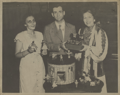 A photographic print of three individuals standing indoors, holding handcrafted dolls and a diorama. A handcrafted dollhouse is on the table in front of them. All individuals appear to be white. "Photographs, circa 1940s: Sharon Goldstein's collection of scout photographs (sent to Dorothy Armstrong); primarily consisting of christmas celebrations, undated, circa 1948 (based on uniforms)." written on item folder. Handwritten on standard letter mailer envelope: "JPP Sent 8/7/81, Dear Dorothy, The three dollars are enclosed. And here are the girl scout pictures. Hope they're a real "Blast from the Past"! Thanks for being so patient, sorry for the delay. Sharon (Address. 2022 Monument Ave. Richmond 23220."