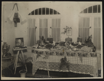 A photographic print of a buffet table and a portrait of an individual on a stand, which appear to be some sort of memorial event. "Photographs, circa 1940s: Sharon Goldstein's collection of scout photographs (sent to Dorothy Armstrong); primarily consisting of christmas celebrations, undated, circa 1948 (based on uniforms)." written on item folder. Handwritten on standard letter mailer envelope: "JPP Sent 8/7/81, Dear Dorothy, The three dollars are enclosed. And here are the girl scout pictures. Hope they're a real "Blast from the Past"! Thanks for being so patient, sorry for the delay. Sharon (Address. 2022 Monument Ave. Richmond 23220.""[Illegible] Mrs [Tallens?] " handwritten in pencil on back. ""Photo by C. [Illegible], McCarter [Illegible]" handwritten on backside.