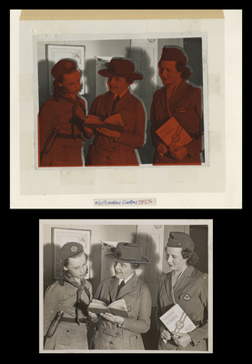 A photographic print of three individuals looking at a book. On the left is a young Girl Scout in uniform, the other individuals are older adults in leader uniforms. The leader on the right holds a book titled "Volunteers for Victory: Girl Scout Adult Jobs and Defense." All individuals appear to be white. "Photographs, circa 1940s: "Volunteers for Victory " (Intermediate scout with two adult scouts), undated" written on item folder. "This Photograph is Property of The Richmond Times. Dispatch The Richmond News Leader And Must Not Be Used Without Permission" stamped on back. "Mrs Smith wears old style uniform, Mrs. H. Laurie Sith, [illegible], Girl Scouts, March 12 1942" handwritten on back. Two versions of this photograph are displayed here, both with and without its rubylith.