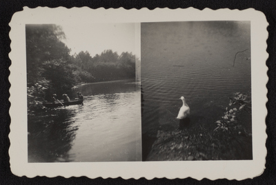 A photographic print of two photographs side by side, with scalloped edges. On the left, approximately five individuals sit in a row boat on a lake with trees on the left side and in the background. On the right an image of a duck on a lake. All individuals are presumed to be white. "Camp Scenes, undated, circa 1940s (negatives included). likely camp pocahontas" written on item envelope. "605L" printed on back.