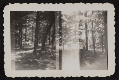 A photographic print of two photographs side by side, with scalloped edges. On the left, two individuals stand among trees outdoors. On the right, four individuals stand amongst trees, leaning on a trail sign that is illegible. All individuals are presumed to be white. "Camp Scenes, undated, circa 1940s (negatives included). likely camp pocahontas" written on item envelope. "605L" printed on back.