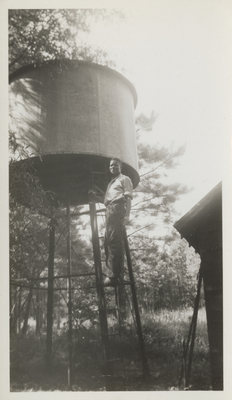 A photographic print of an individual in a button-up shirt and trousers standing on the ladder of a water tower, with trees on the left and a partially visible cabin on the right. The individual appears to be Black. "Camp Scenes, undated, circa 1940s (negatives included). likely camp pocahontas" written on item envelope.