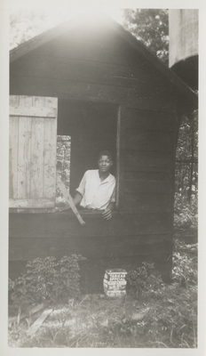 A photographic print of an individual inside a cabin, visible through the open window of the cabin. They wear a button-up shirt. A can of motor oil is visible below the window. The individual appears to be Black. "Camp Scenes, undated, circa 1940s (negatives included). likely camp pocahontas" written on item envelope.