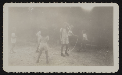 A photographic print of approximately six young individuals playing outdoors in day clothes. One individual holds what appears to be a jump rope. All individuals are presumed to be white. "Camp Scenes, undated, circa 1940s (negatives included). likely camp pocahontas" written on item envelope.