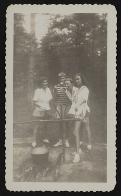 A photographic print of four individuals standing outdoors at a cooking campfire with a pot and roasting stand over it. Two individuals hold and eat meat off large bones. All individuals appear to be white. "Camp Scenes, undated, circa 1940s (negatives included). likely camp pocahontas" written on item envelope.