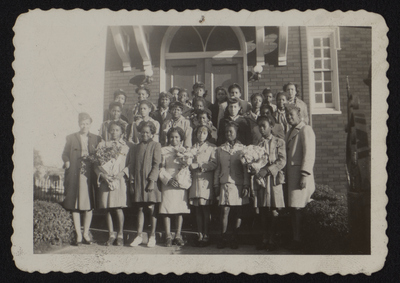 A photographic print of approximately twenty-seven individuals standing in four rows on steps leading up to a building outdoors. Most individuals wear coats and day clothes, with a few wearing Girl Scout uniforms. Three individuals in the front row hold bouquets of flowers. All individuals appear to be Black. "Unidentified black troops, undated, circa 1940s" on item envelope.