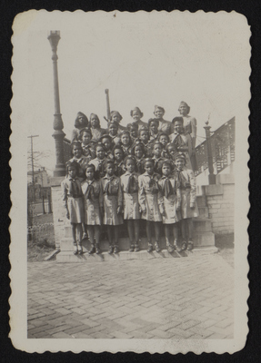 A photographic print of approximately twenty-eight individuals standing in five rows on an outdoor staircase. All individuals wear Girl Scout uniforms, with younger scouts in the front wear berets and older scouts/leaders in the back wearing Garrison caps. All individuals appear to be Black. "Unidentified black troops, undated, circa 1940s" on item envelope.