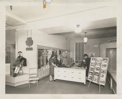 A photographic print of an indoor space with a sign that reads "Girl Scout Room." Below the sign a dummy dressed in a Girl Scout uniform and beret sits on a chair. In the room, three individuals in day clothes stand around a large table looking at materials including berets, hats, and uniforms. Uniforms also hand in a closet to the left of the individuals. A bulletin board with Girl Scout photographs is also visible. All individuals appear to be white. "Miss Ida Saunders" handwritten on back.