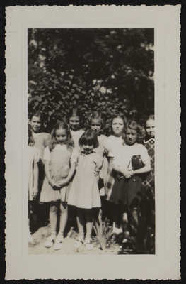 A photographic print of eight young individuals standing outdoors in two rows. They are likely a Brownie troop, and wear day clothes. All individuals appear to be white. "Brownie Troop 54," undated, circa 1940s-1950s" written on item envelope. "B. Troop 54" handwritten on back.