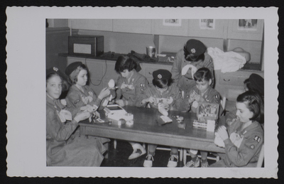 A photographic print of approximately nine individuals in Girl Scout uniforms working on a craft around a table. All individuals are presumed to be white. "Troop 48 Temple Beth El" handwritten on back.