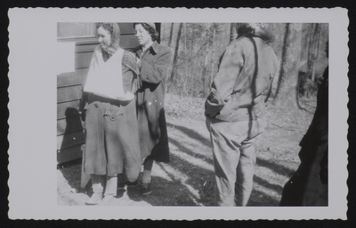 A photographic print of three individuals outdoors, one stands on the right with their back to the camera. The other stand on the left next to a cabin, one individuals ties fabric behind the back of the other. All are wearing winter clothing.