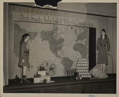 A photographic print of a window display at L.L. Stearns & Son department store in Williamsport, Pennsylvania. The background is a painting of a world map, with "Girl Scouts help build World Friendship" at the top. Two mannequins stand on either side, wearing Girl Scout uniforms. Also in the display are boxes of rice, dress shoes, and cans of milk. "Window L. L. Stearns Dept store for week of Mar. 12th - 19th '44 May – Pale Blue Background. Deep Blue land areas ridged in white. Yellow arrow markings, International. Trefoil and ribbons." handwritten on back. "Mae C" handwritten on back