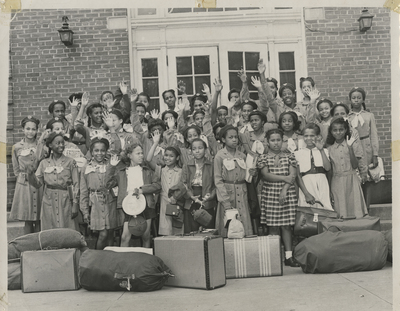 A photographic print of approximately three dozen individuals, mostly Brownie and Intermediate Girl Scouts, standing in four rows outdoors in front of a building. The majority of individuals are raising their hands. Several suitcases and duffle bags are on th the ground in front of them. Most wear Girl Scout uniforms. All individuals appear to be Black. "Black: Brownie and Intermediate scouts preparing trip ca 1948 - 1956" written on item folder. "Fred Harris Photographs 1435 Montello Ave., N.E. Atlantic 5019 Wash. 2. D.C." stamped on back.