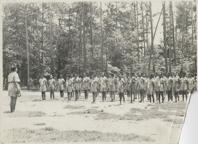 A photographic print of several dozen young Girl Scouts in uniforms, standing in five lines in a clearing, with one individual standing in front of them. Trees are visible in the background. All individuals appear to be Black.