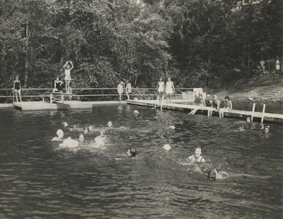 A photographic print of Girl Scouts swimming in a lake. Ten individuals sit and stand on a dock, while approximately another dozen swim in the water in the foreground. All individuals are presumed to be white. "Swimming" handwritten on back. "Girl Scouts Of Richmond, VA, INC. Allison Building 803 1/2 E. Main ST. Richmond 19, VA" stamped on back. "A.L. Dementi 219 E. Grace St. Richmond, Virginia" stamped on back.