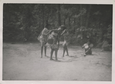 A photographic print of four people wearing costumes meant to mimic traditional Indigenous clothing in a clearing. Three dance while another sits on the ground playing a drum (likely a djembe) held between their knees. The dancers wear skirts made of paper or fabric cut to look like fringe. Camp Pinoaka was the location where Black Girl Scouts attended camp when troops were still segregated until the 1960s. The photograph is blurry. Handwritten on back: "Camp Pinoaka Unit 2. - 1950 "Dancing" - The Indian Way."
