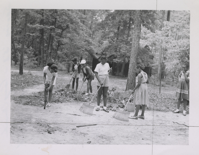 A photographic print of four individuals raking leaves outdoors, with a fifth on the left chopping wood. A sixth looks on. All individuals wear day clothes and appear to be Black. "Spring '53 - Camp Pinoaka, #3 + 42 - Fifth Bapt. Ch., [Doris?] Prentiss, Portia Key[crossed out] Kee, Shirley Tyler, Jean Martin, Carolyn Edwards" handwritten on back.