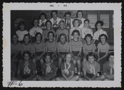 A photographic print of 24 young Girl Scouts sitting and standing in four rows indoors. They wear various uniforms, including short sleeve button up shirts with neckerchiefs and striped t-shirts. All individuals appear to be white. "Jul. 55" typed on front. "#6" handwritten on front.