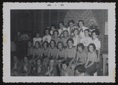 A photographic print of 24 young Girl Scouts sitting and standing in four rows indoors. They wear various uniforms, including short sleeve button up shirts with neckerchiefs and striped t-shirts. All individuals appear to be white. The photograph is taken from an angle, and an individual can be seen in the background on the left, holding something in their hands. "Jul . 55" typed on front.