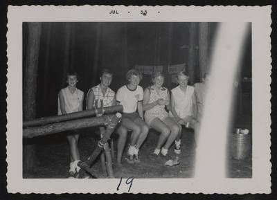 A photographic print of six individuals sitting on a bench outdoors, with trees and a clothesline visible in the background. They are likely camp counselors. All individuals appear to be white. "Jul . 55" typed on front. "19" handwritten on front.
