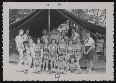 A photographic print of twenty individuals sitting and standing in three rows underneath a tent. Sixteen individuals are young Girl Scouts wearing either short sleeved button up shirts with neckerchiefs or striped t-shirts. Four counselors wear button up short sleeve shirts with neckerchiefs and shorts. All individuals appear to be white. "Jul . 55 ." typed on front. "9" handwritten on front.