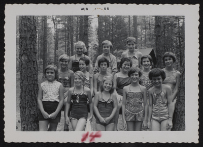 A photographic print of 14 young Girl Scouts standing outdoors between two trees in three rows. Most wear swimsuits and all appear to be white. The roof of a cabin is visible in the background. "Aug . 55" typed on front. "14" handwritten on front.