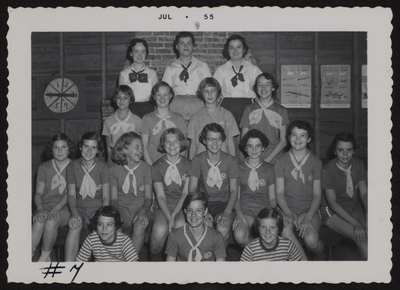 A photographic print of 18 individuals sitting and standing in four rows indoors. Most wear short sleeve button-up shirts and neckerchiefs, with two individuals in the front row wearing striped t-shirts. All individuals appear to be white. "Jul. 55" typed on front.