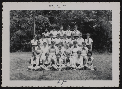 A photographic print of 26 individuals sitting and standing in four rows outdoors with trees in the background. Most wear short sleeve button-up shirts with neckerchiefs. They are likely camp counselors. Most individuals appear to be white, though this may be an integrated group of camp counselors. "Jun. 55" typed on front.