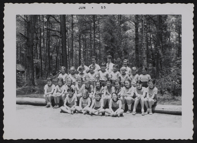 A photographic print of 28 individuals sitting and standing in four rows outdoors with trees in the background. Most wear striped t-shirts. The four individuals in the back row wear button-up short sleeve shirts with neckerchiefs, they are likely camp counselors. All individuals appear to be white.. "Jun. 55" typed on front.