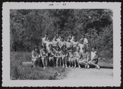 A photographic print of 19 individuals sitting and standing in three rows outdoors with trees in the background. Most wear button-up shirts with neckerchiefs, some wear striped t-shirts. The four individuals in the back row appear to be camp counselors. All individuals appear to be white. "Jun. 55" typed on front."Jun. 55" typed on front.